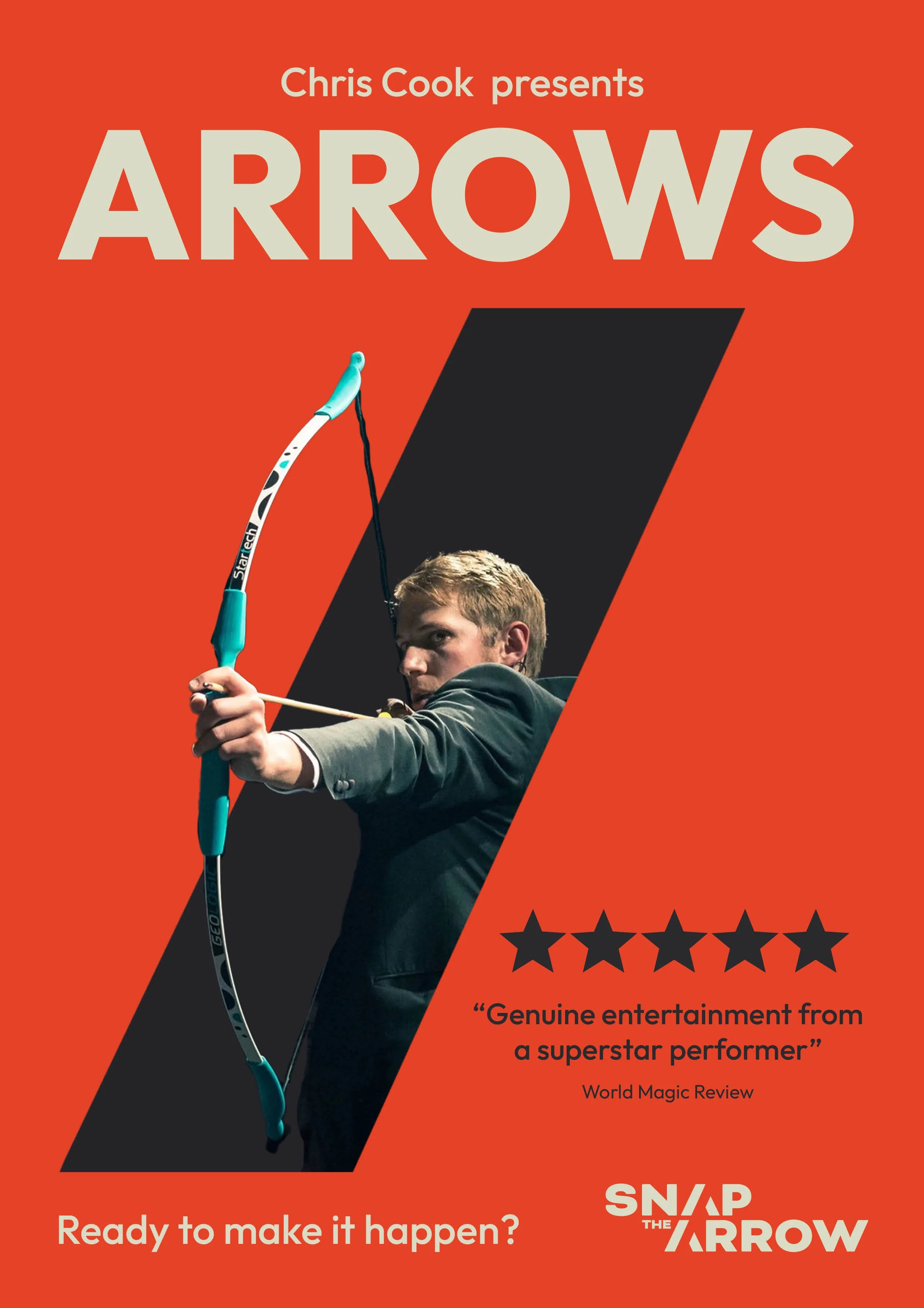 The arrows routine was first developed in 2015 by Chris Cook and Rhys Williamson for the show Truth or Dare. In it, an audience member was invited onstage to do something brave: they wrote down a dream, placed it on an archery arrow, rested the arrow against the soft part of their neck, and took a bold step forward. The moment challenged audiences to reflect on their own ambitions and ask what might be stopping them from making them happen.