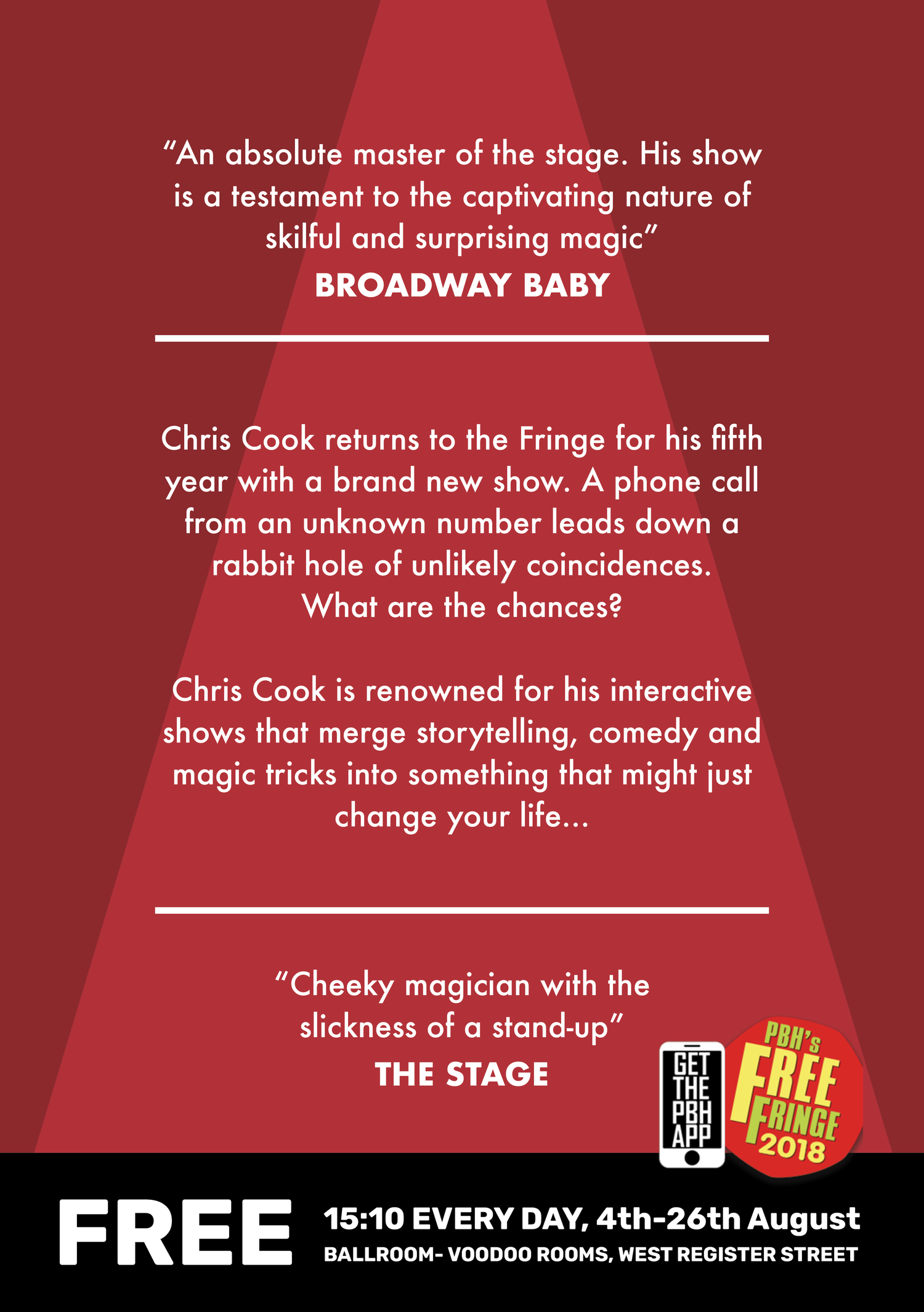 Chance debuted at the 2018 Edinburgh Fringe Festival. The show was an exploration of the possibility coincidences through the lens of a magician who may in fact be a time-traveller.