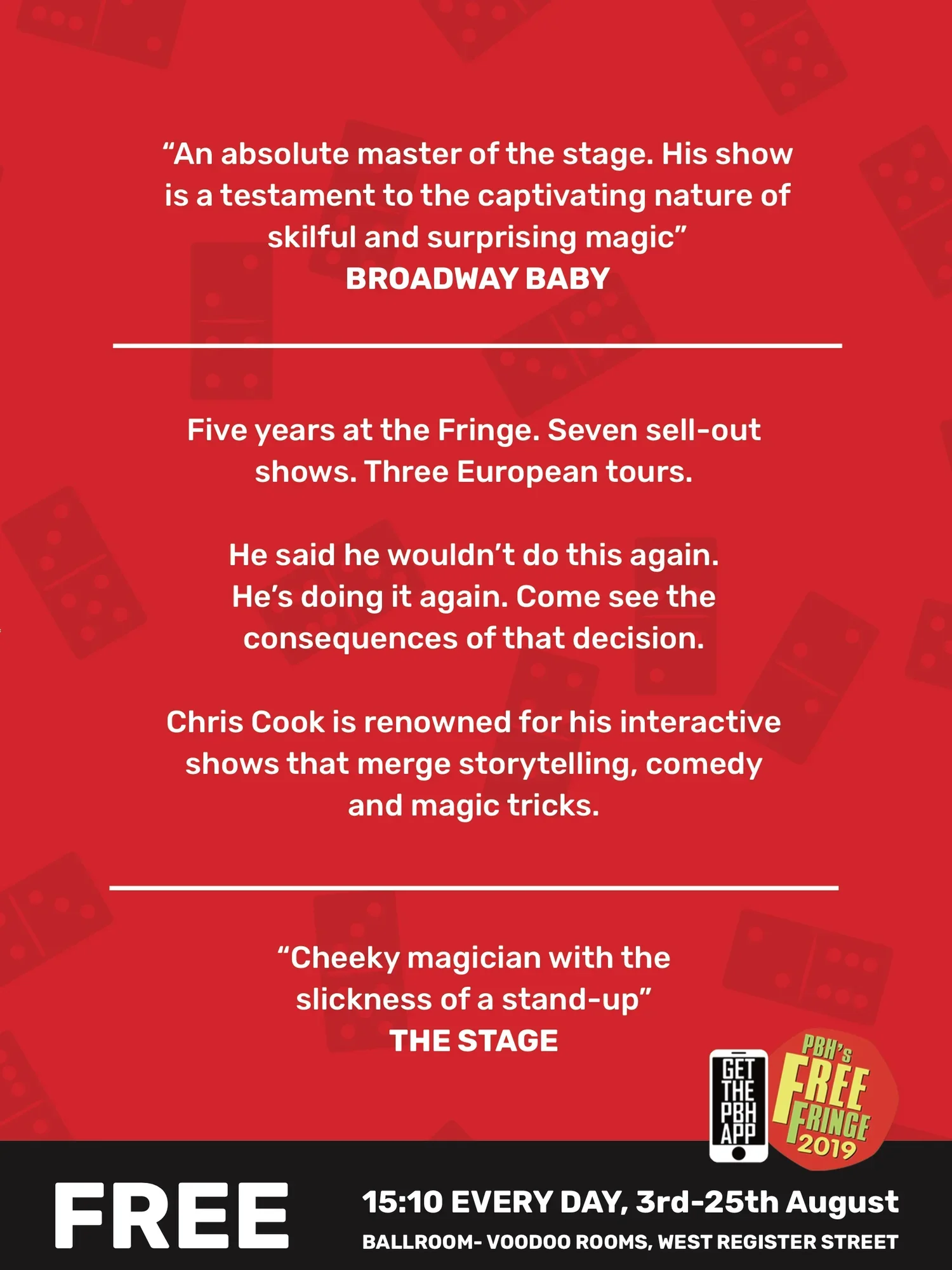 Consequences debuted at the 2019 Edinburgh Fringe Festival to packed out crowds for the whole month. The show was a unique, meta commentary that showed a peek-behind-the-curtain into the writing process for a magic show. Set in an office with Chris sat at a typewriter, it shows the pain and monotony of the creative process. The magic takes place through flashbacks of alternative performances, transporting the audience onto cruise ships, children’s parties and into the perilous depths of an artist who doesn’t know what he’s trying to say.