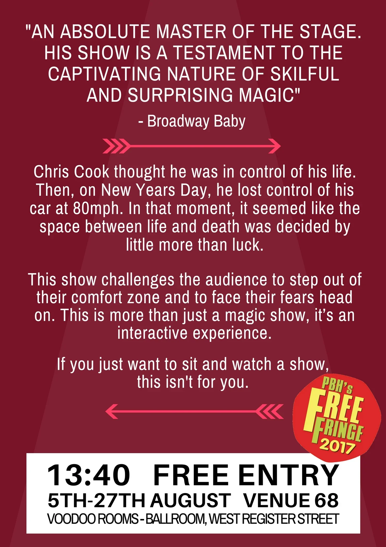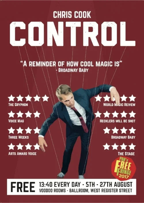 Control debuted at the 2017 Edinburgh Fringe Festival. The show was a breakthrough hit and introduced many people to Chris’s famous ‘Arrows’ finale. Control was a hugely successful show, loved by critics and audiences. it played for a month in Edinburgh before doing various tour dates in Ulverston, Bristol, Vienna and London.
